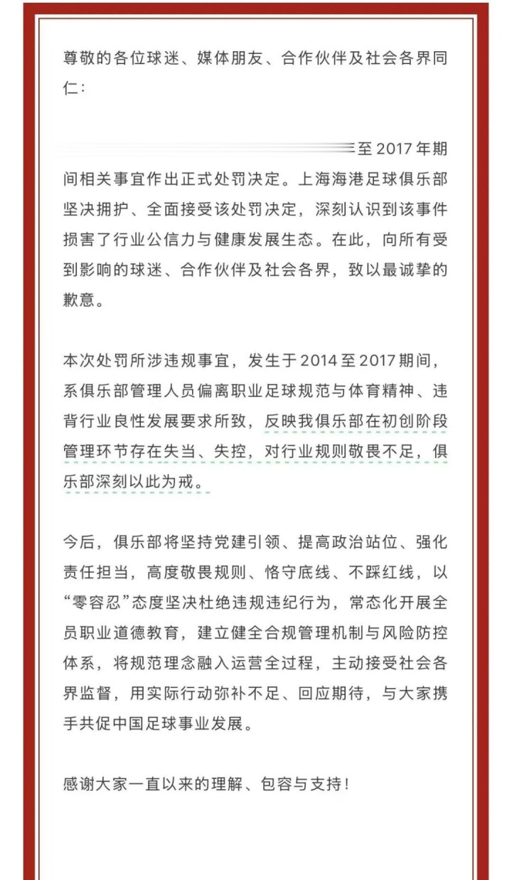 上海申花官方发布《关于历史问题处罚的公告》,表示尊重并接受该处罚决定,向球迷和合作伙伴致以最诚挚的歉意。